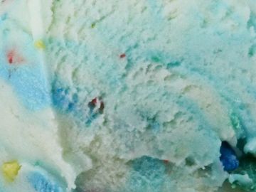 Sweet birthday cake-flavored ice cream with swirls of blue frosting and bursts of colorful confetti sprinkles.